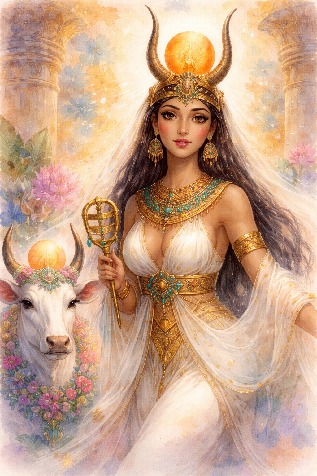 Hathor é o sorriso do divino. Seu nome pode ser traduzido como “A Casa de Hórus”, pois ela é o ventre celeste que acolhe o Sol, a Lua e a própria consciência humana em seu processo de amadurecimento. Deusa-vaca, deusa-mulher, deusa-estrela: Hathor manifesta a força do feminino que nutre, encanta e desperta.