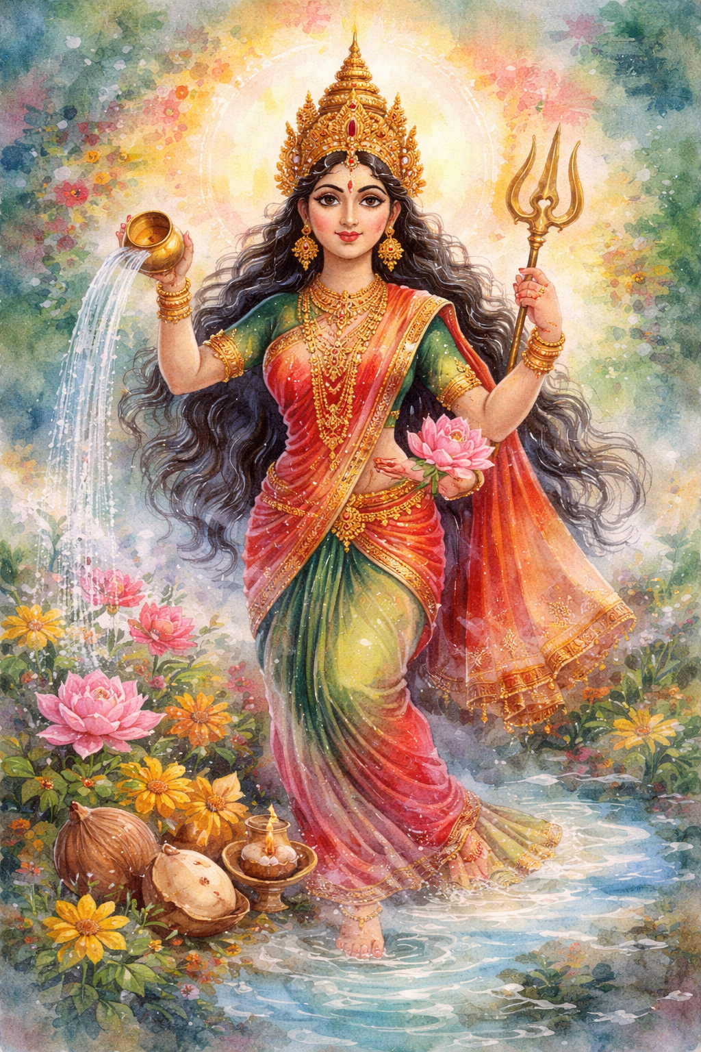 Mantras: Om Sri Bisal Mariamman Namah – Mãe da Terra Viva, purifica meu corpo, minha mente e meu caminho. – No calor da vida, tua água sagrada me refresca e me cura. – Eu honro a força feminina que protege, corrige e restaura. – Onde a Mãe pisa, a doença se dissolve e a vida floresce.